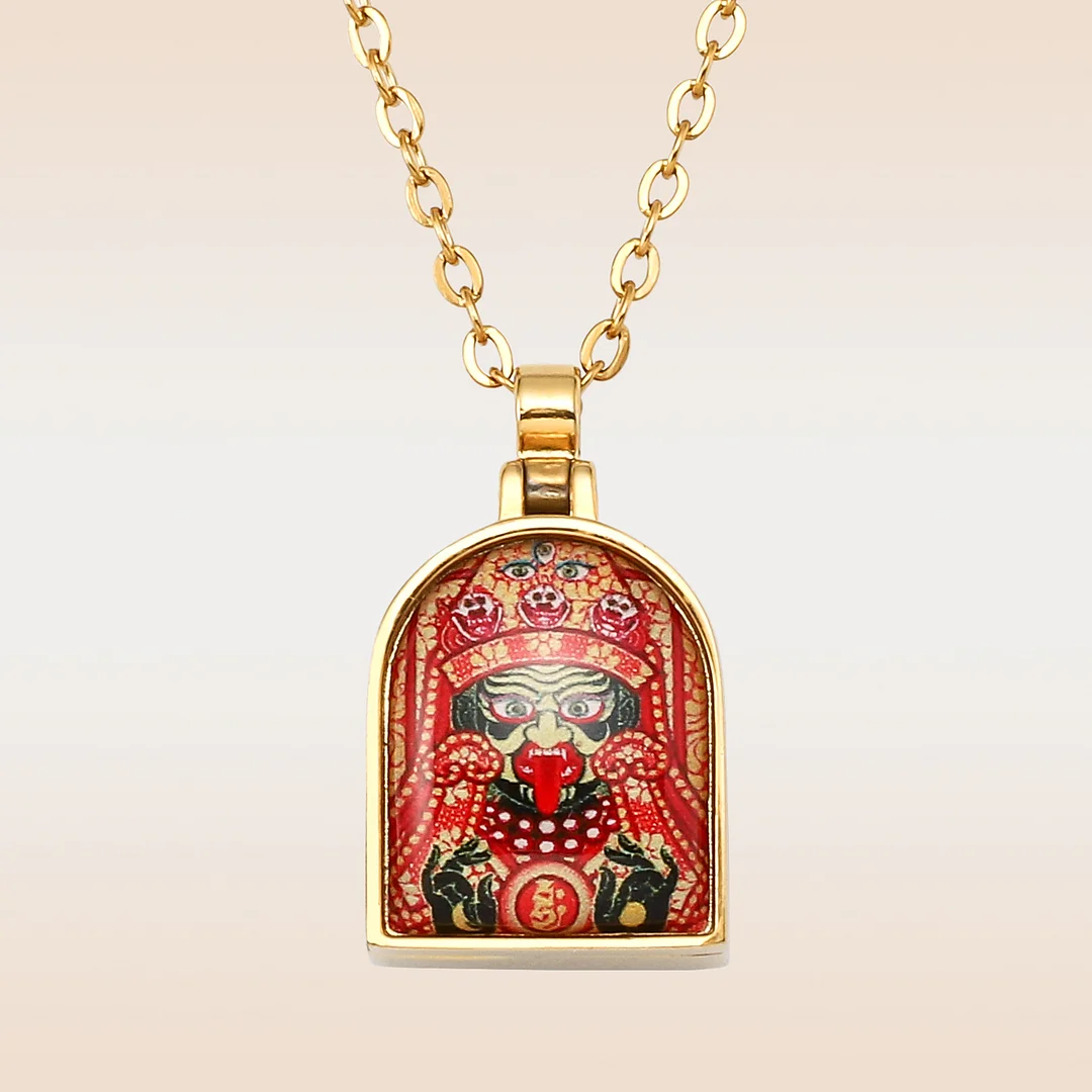 The Zashi Lhamo Thang-ga Necklace, featuring a pendant box containing a volume of scriptures, is a spiritually enriched accessory. Inspired by traditional Tibetan Buddhist art and the deity Zashi Lhamo, the necklace takes on a sacred dimension with the inclusion of scriptures, suggesting a portable repository of spiritual wisdom and teachings. Zashi Lhamo, often depicted as a wrathful protector, adds a layer of divine energy to the necklace. Wearing this intricately designed piece becomes a personal ritual, symbolizing a connection to both the protective forces of Zashi Lhamo and the transformative power of sacred scriptures, creating a harmonious blend of art, spirituality, and wearable devotion.