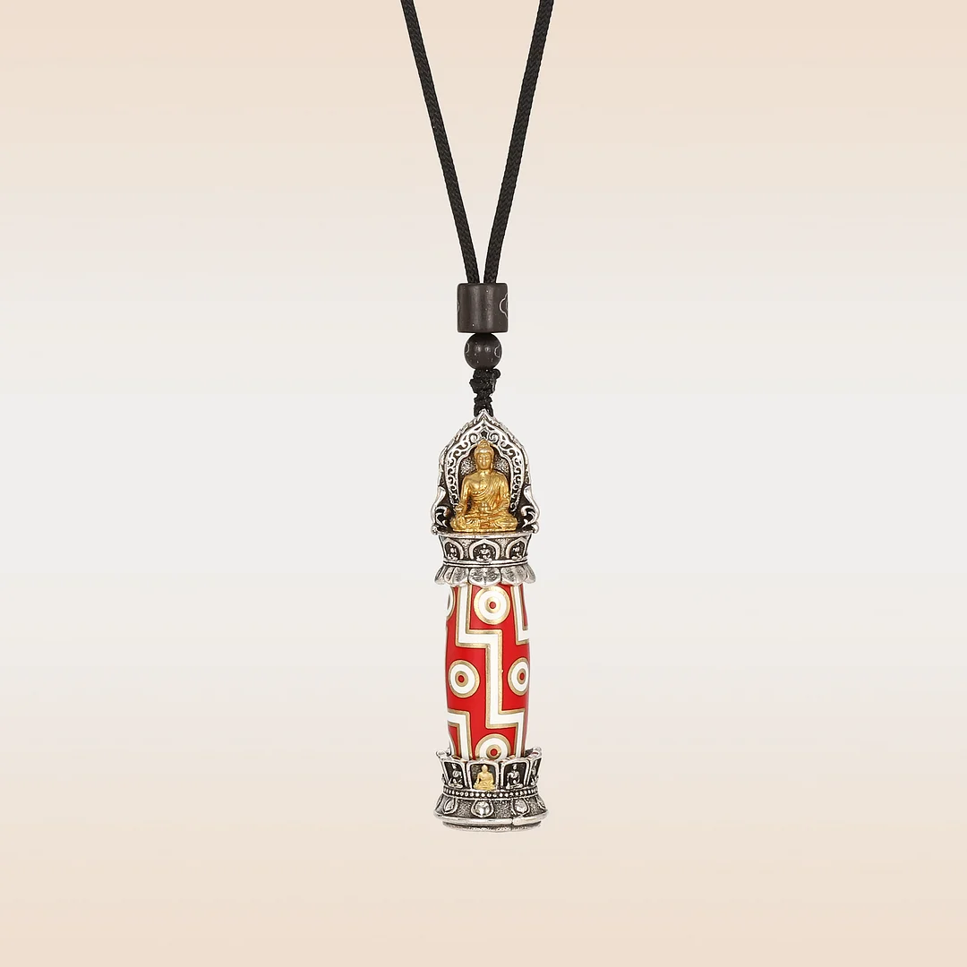 The Medicine Buddha Dzi Bead Nine Eyes Necklace is a spiritually significant accessory that combines the healing energy of the Medicine Buddha with the protective and auspicious qualities of a Nine Eyes Dzi bead. The Medicine Buddha, a revered figure in Mahayana Buddhism, is associated with healing and the alleviation of suffering. The Nine Eyes Dzi bead, with its unique patterns, is believed to bring heightened spiritual insight and blessings. Wearing this necklace is a devotional act, symbolizing a connection to the healing energies of the Medicine Buddha and the enhanced spiritual protection associated with the sacred Nine Eyes Dzi bead. It becomes a wearable talisman, expressing a deep connection to Buddhist traditions and the pursuit of well-being.